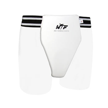 WACOKU women's cup, approved by the WTF (World Taekwondo Federation), white. This type of protection features vinyl-covered foam padding in the front area. Available in sizes XS to XL. CE approved.