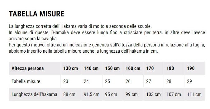 Different schools use different hakama lengths. Some schools require the hakama to reach above the ankle, while others require it to touch the tatami and cover the feet. For this reason, in addition to a general indication of a person's height in relation to their size, we have also included the hakama length in centimeters in the size chart.